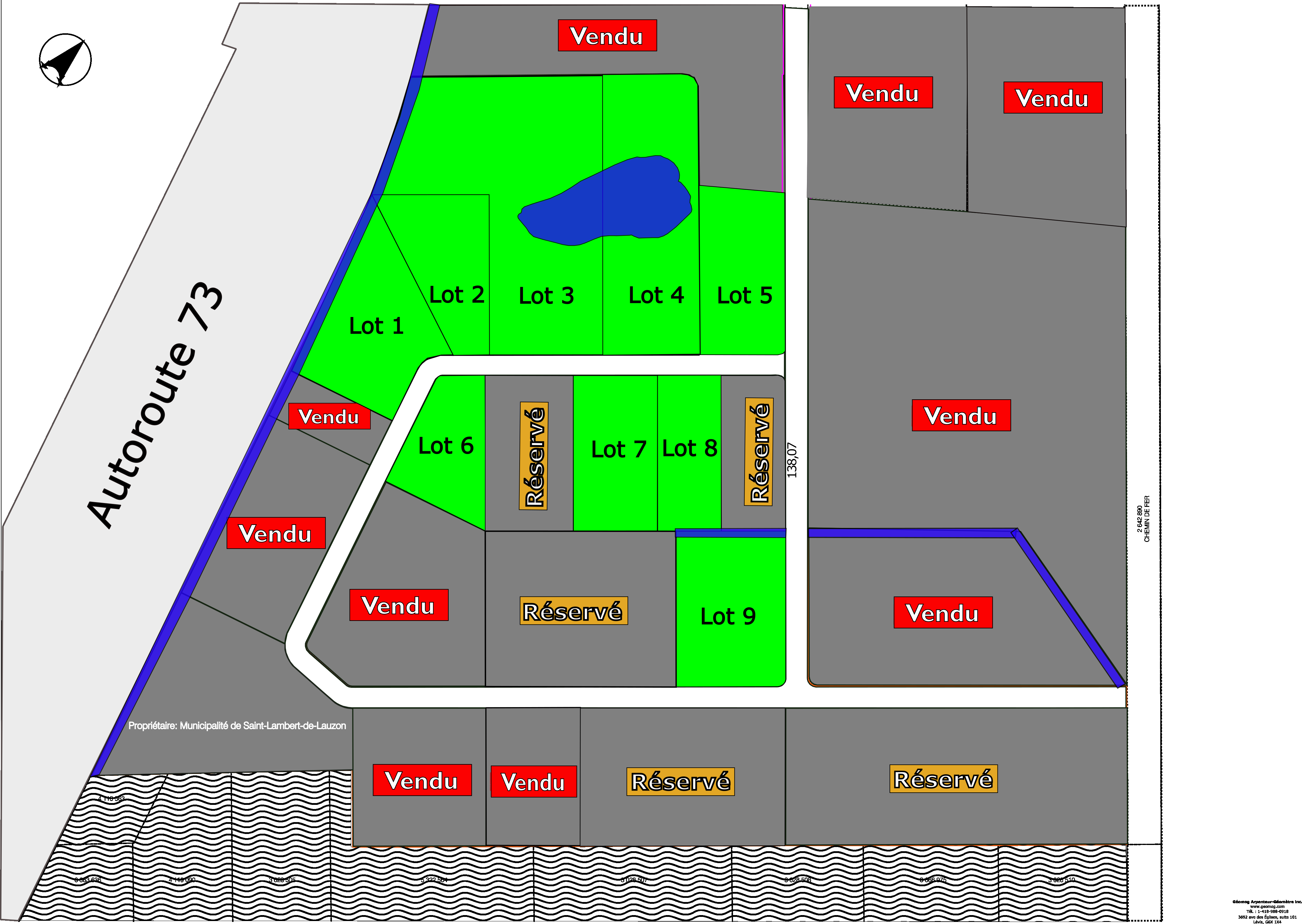 Les lots projetés sont représentés sur le plan ci-dessous et sont détaillés dans le tableau ci-bas. Il est important de souligner que ces propriétés sont temporairement divisées ainsi, et des ajustements peuvent être effectués pour répondre aux besoins spécifiques des promoteurs.